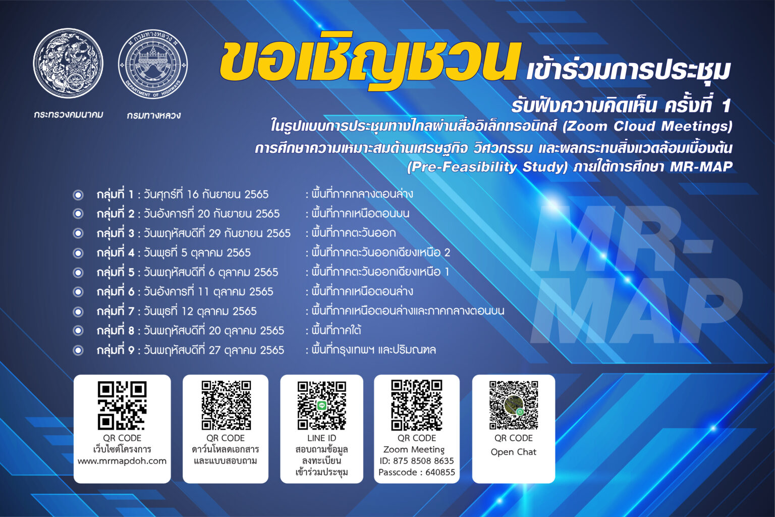 ประชุมรับฟังความคิดเห็น ครั้งที่ 1 การศึกษาความเหมาะสมด้านเศรษฐกิจ วิศวกรรม และผลกระทบสิ่งแวดล้อมเบื้องต้น (Pre-Feasibility Study) ภายใต้การศึกษา MR-MAP