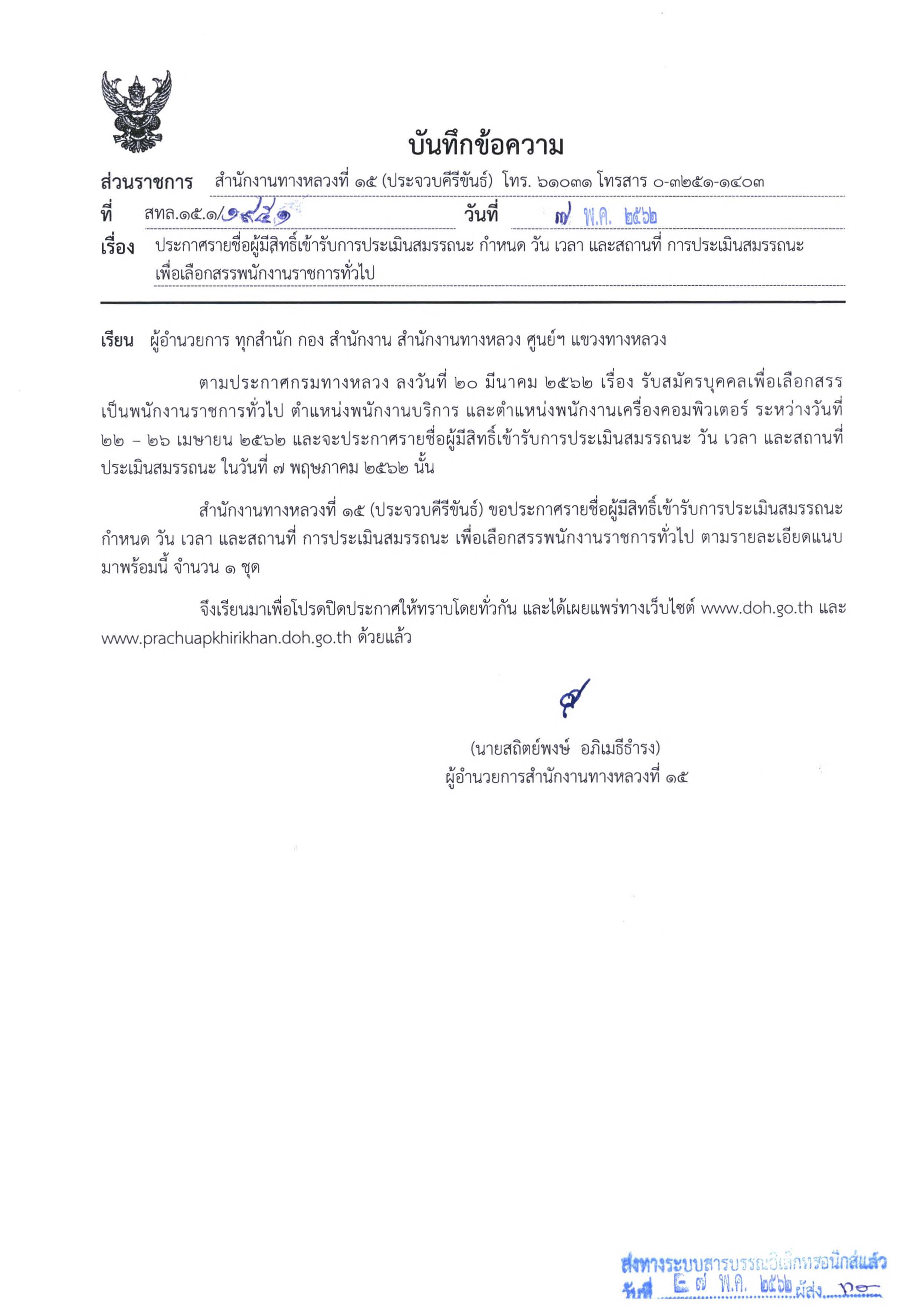 252 07/05/2562 ประกาศรายชื่อรับผู้มีสิทธิ์เข้ารับประเมินสมรรถนะครั้งที่ 1