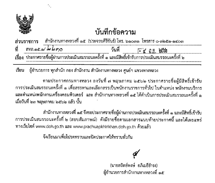 243 04/06/2562 ประกาศรายชื่อผู้ผ่านการประเมินสมรรถนะครั้งที่ 1 และมีสิทธิ์เข้ารับการประเมินสมรรถนะครั้งที่ 2 ตำแหน่งพนักงานบริการ และตำแหน่งพนักงานเครื่องคอมพิวเตอร์