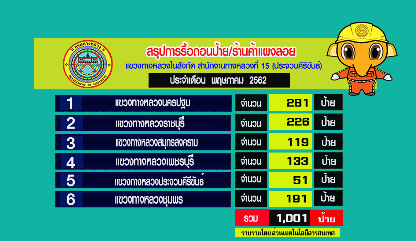 242 05/06/2562 ผลการรื้อถอนป้ายโฆษณาที่ไม่ได้รับอนุญาตในเขตทางหลวง ของแขวงทางหลวงในสังกัด สทล.15 ประจำเดือนพฤษภาคม 2562