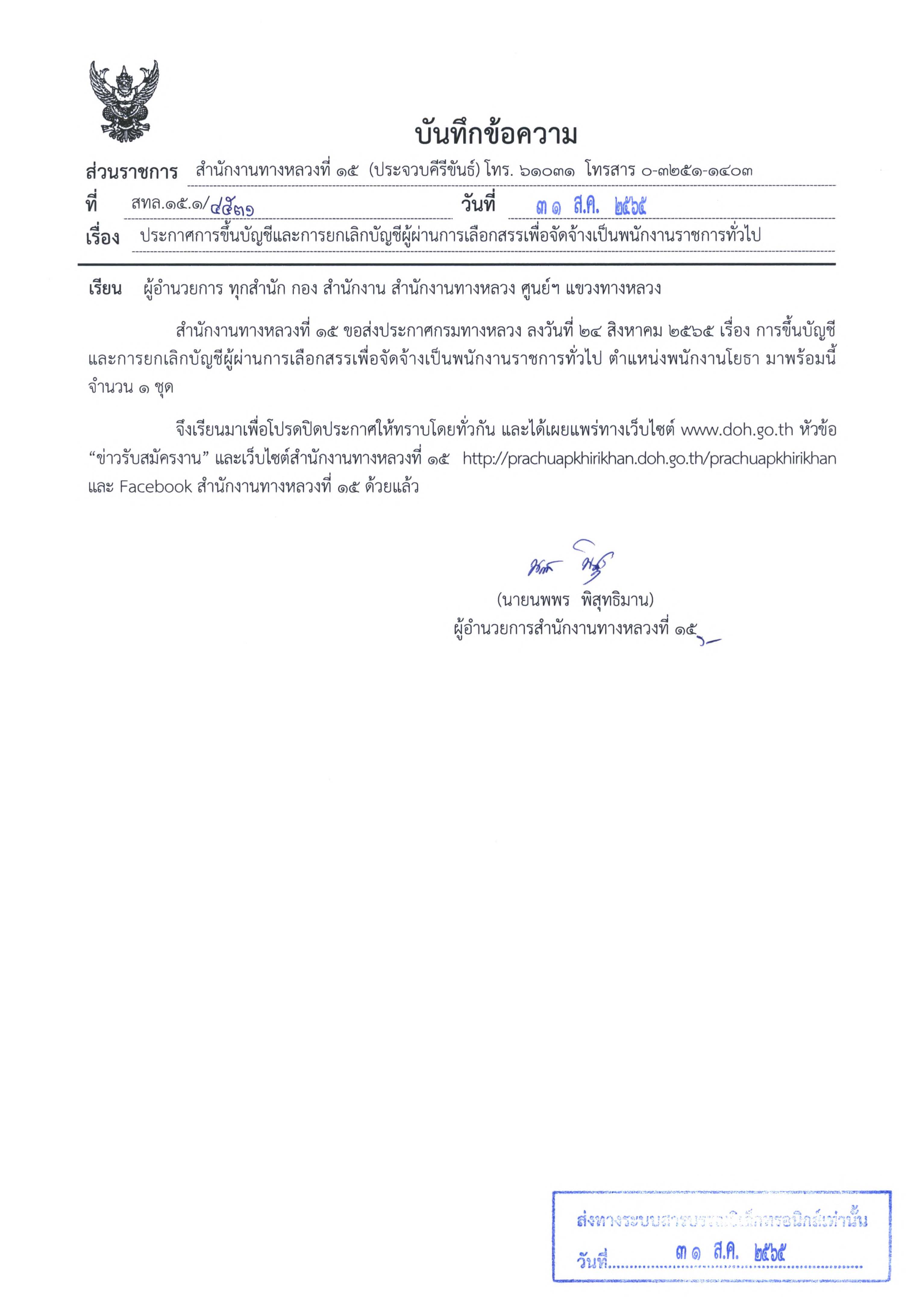 | ประกาศการขึ้นบัญชีและยกเลิกบัญชีรายชื่อผู้ผ่านการเลือกสรรเพื่อจัดจ้างเป็นพนักงานราชการทั่วไป ตำแหน่งพนักงานโยธา จำนวน 2 อัตรา (ประกาศ ณ วันที่ 31 สิงหาคม 65) | 350 | ดาวน์โหลด |