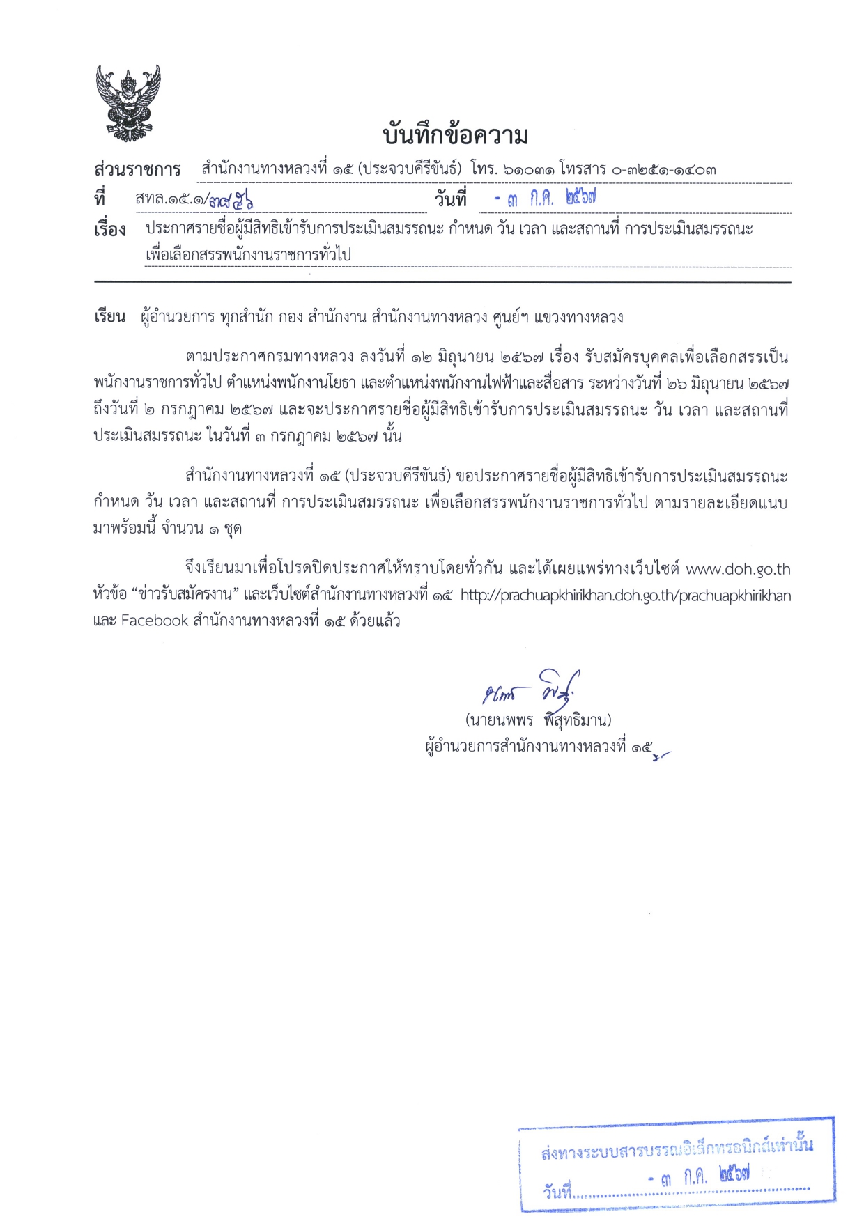3. ตำแหน่งพนักงานไฟฟ้าและสื่อสาร สังกัดแขวงทางหลวงเพชรบุรี จำนวน 1 อัตรา