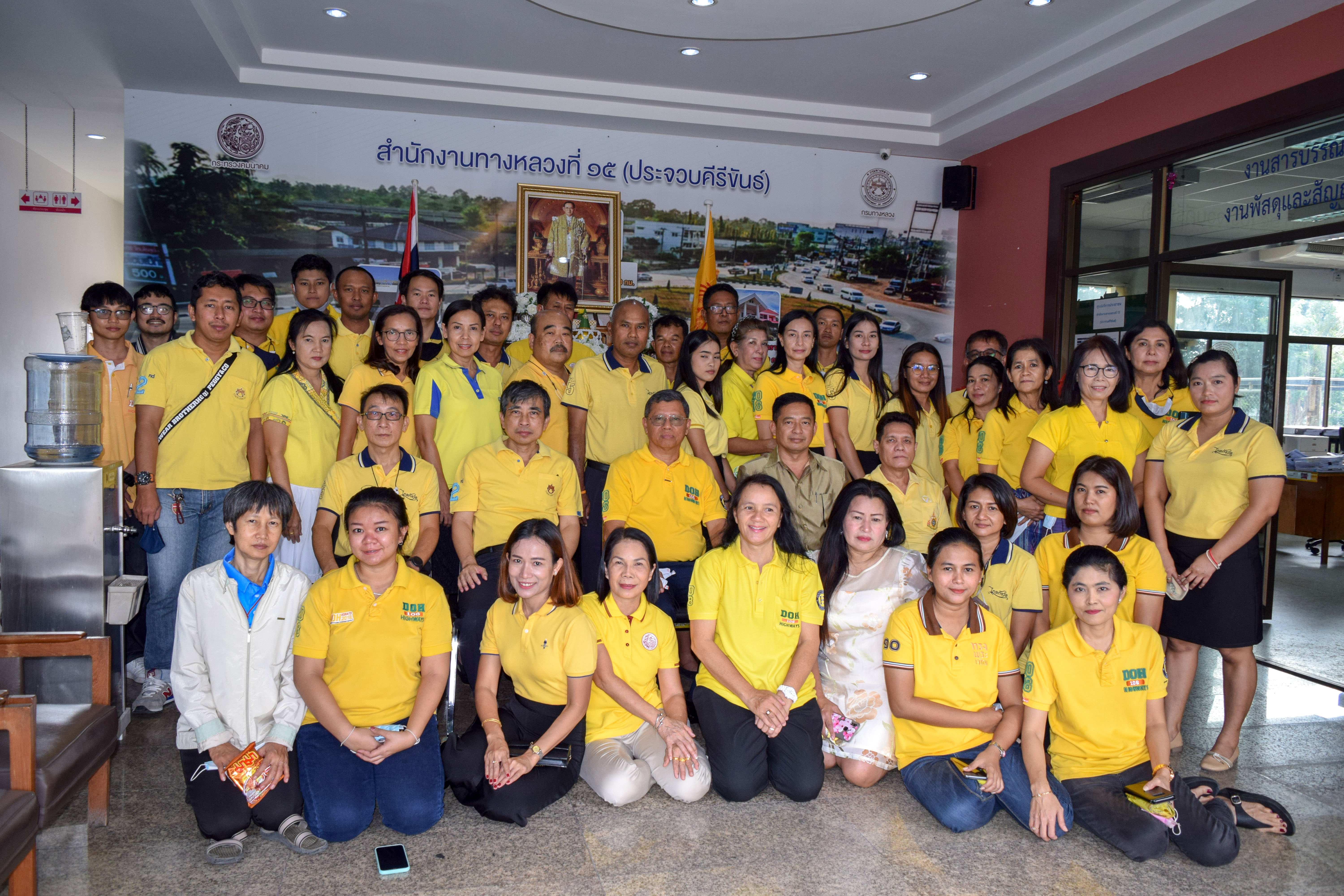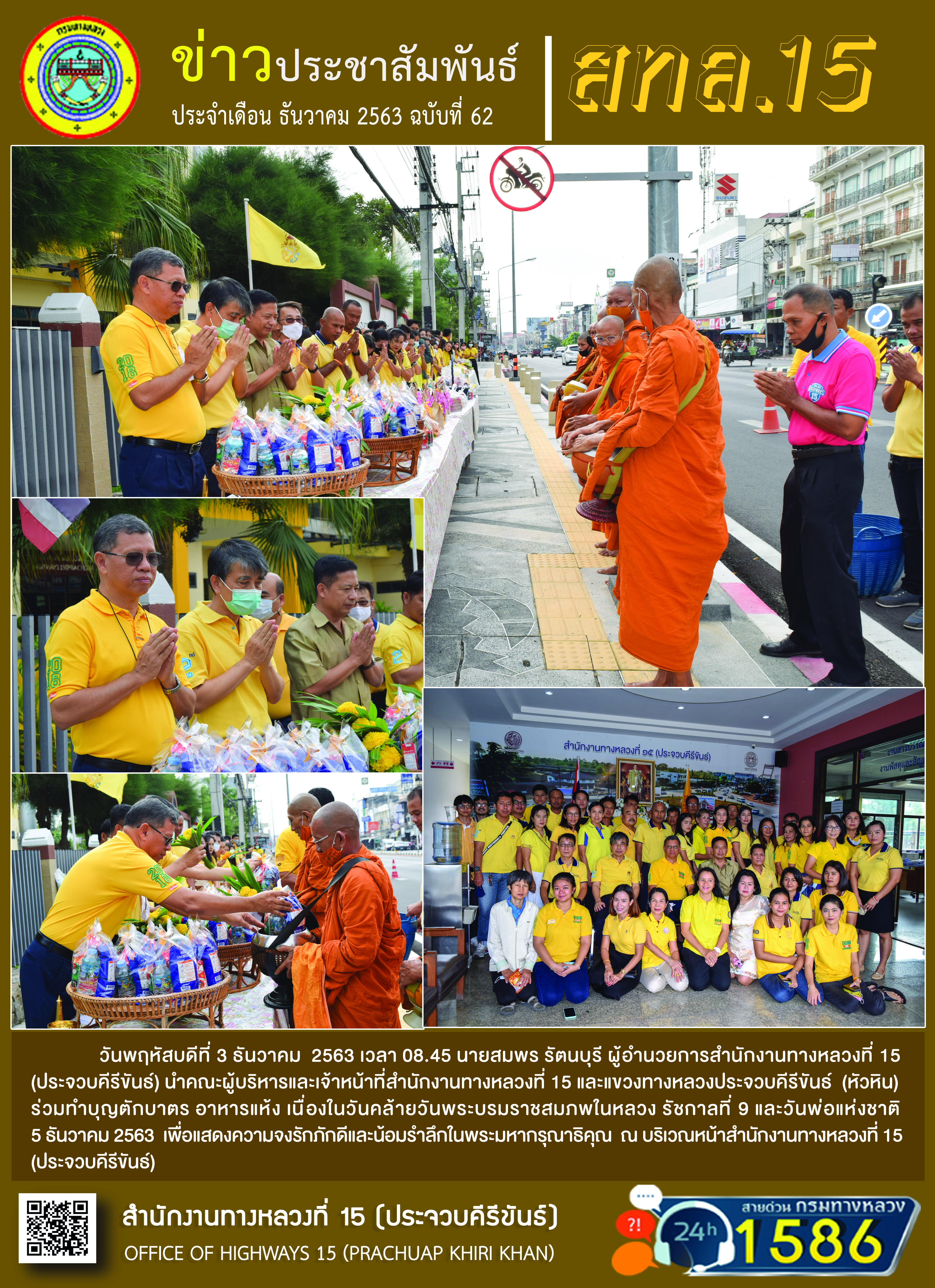 วันพฤหัสบดีที่ 3 ธันวาคม 2563 เวลา 08.45 นายสมพร รัตนบุรี ผู้อำนวยการสำนักงานทางหลวงที่ 15 (ประจวบคีรีขันธ์) นำคณะผู้บริหารและเจ้าหน้าที่สำนักงานทางหลวงที่ 15 และแขวงทางหลวงประจวบคีรีขันธ์ (หัวหิน) ร่วมทำบุญตักบาตร อาหารแห้ง เนื่องในวันคล้ายวันพระบรมราชสมภพในหลวง รัชกาลที่ 9 และวันพ่อแห่งชาติ 5 ธันวาคม 2563 เพื่อแสดงความจงรักภักดีและน้อมรำลึกในพระมหากรุณาธิคุณ ณ บริเวณหน้านักงานทางหลวงที่ 15 (ประจวบคีรีขันธ์)