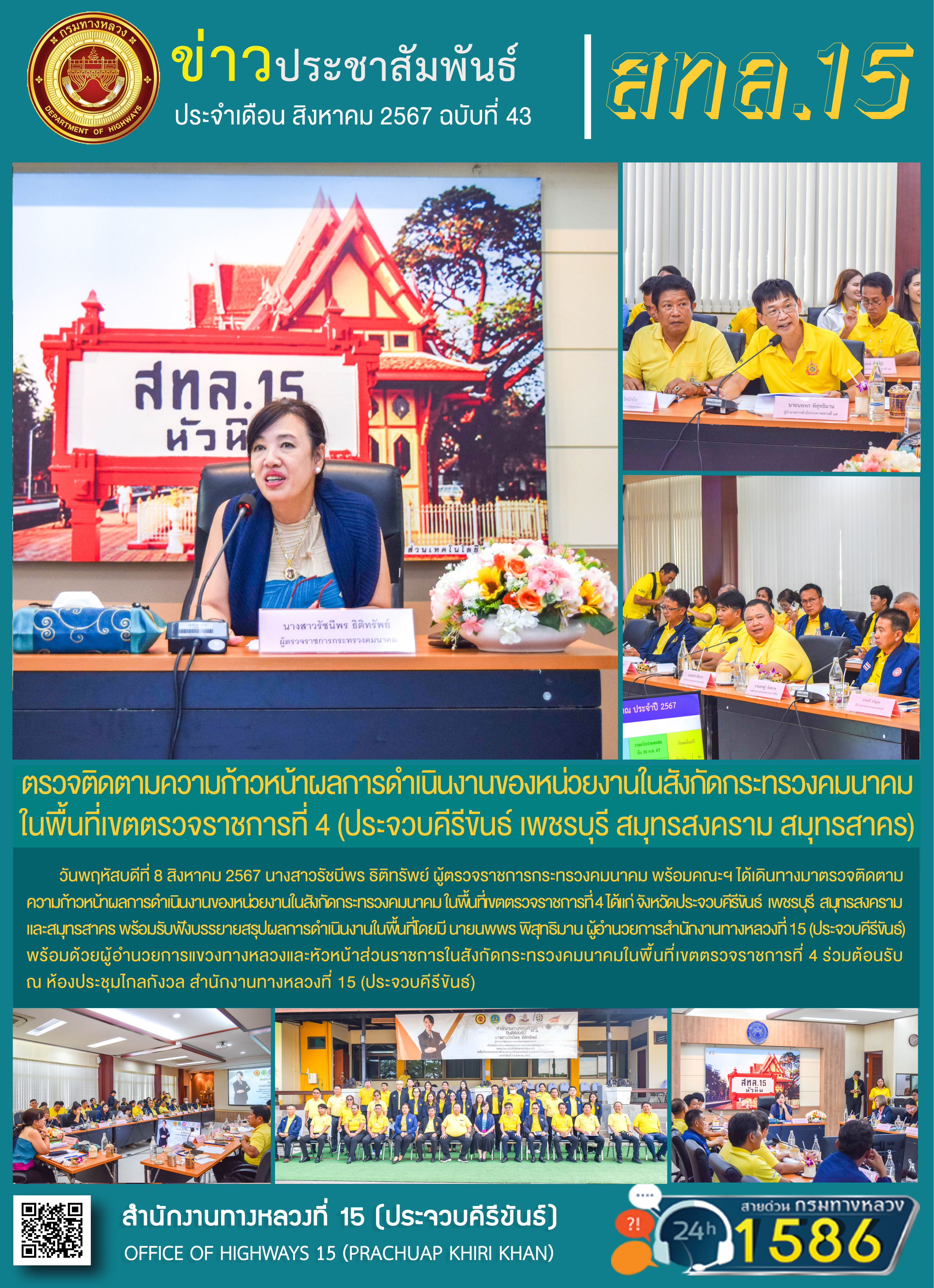 โดยมี นายนพพร พิสุทธิมาน ผู้อำนวยการสำนักงานทางหลวงที่ 15 พร้อมด้วยผู้อำนวยการแขวงทางหลวงและหัวหน้าส่วนราชการในสังกัดกระทรวงคมนาคม ในพื้นที่เขตตรวจราชการที่ 4 ร่วมต้อนรับ ณ ห้องประชุมไกลกังวล สำนักงานทางหลวงที่ 15 (ประจวบคีรีขันธ์)