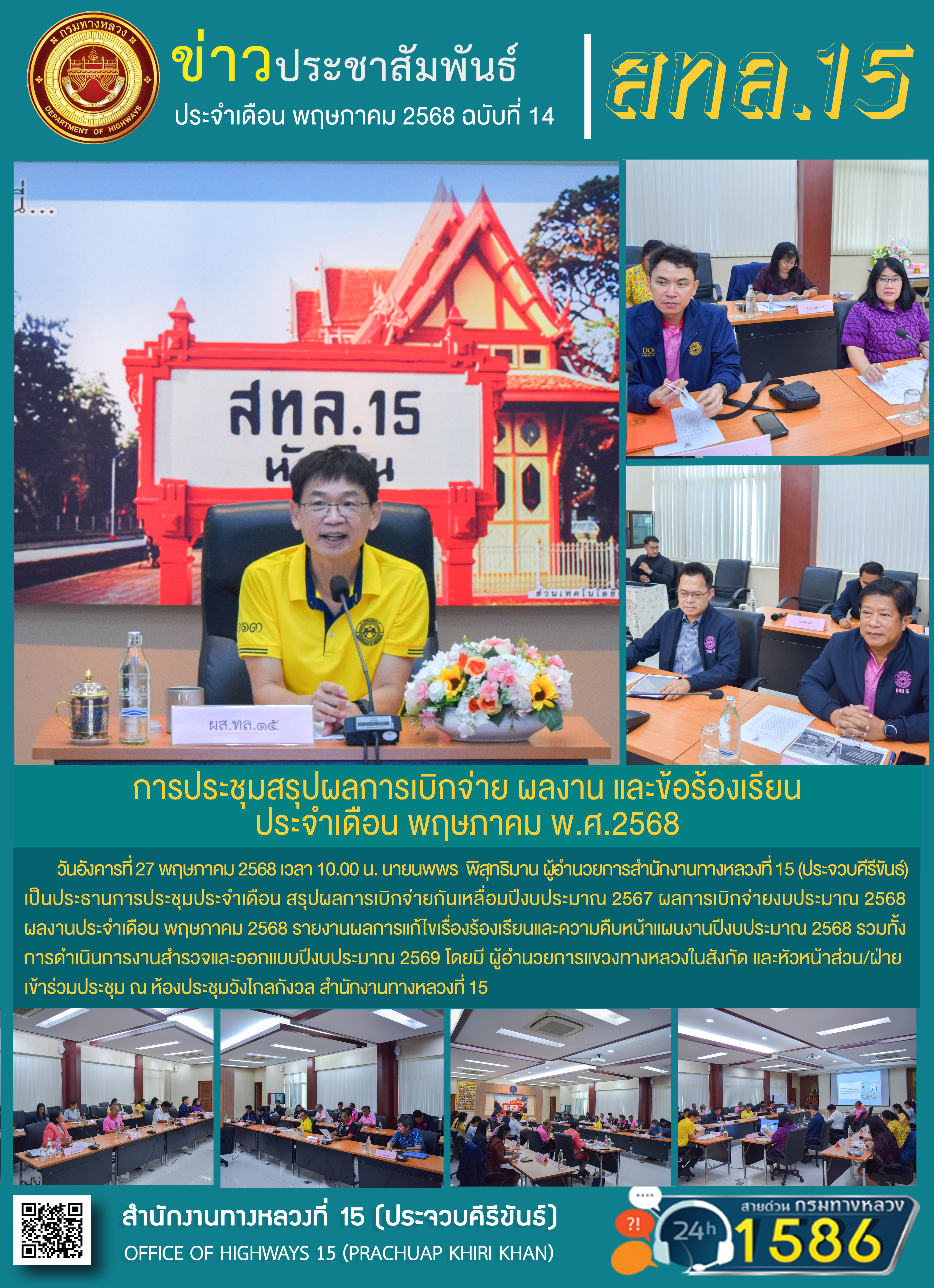 วันอังคารที่ 27 พฤษภาคม 2568 เวลา 10.00 น. นายนพพร พิสุทธิมาน ผู้อำนวยการสำนักงานทางหลวงที่ 15 (ประจวบคีรีขันธ์)เป็นประธานการประชุมประจำเดือน สรุปผลการเบิกจ่ายกันเหลื่อมปีงบประมาณ 2567 ผลการเบิกจ่ายงบประมาณ 2568 ผลงานประจำเดือน พฤษภาคม 2568 รายงานผลการแก้ไขเรื่องร้องเรียนและความคืบหน้าแผนงานปีงบประมาณ 2568 รวมทั้งการดำเนินการงานสำรวจและออกแบบปีงบประมาณ 2569 โดยมี ผู้อำนวยการแขวงทางหลวงในสังกัด และหัวหน้าส่วน/ฝ่าย เข้าร่วมประชุม ณ ห้องประชุมวังไกลกังวล สำนักงานทางหลวงที่ 15