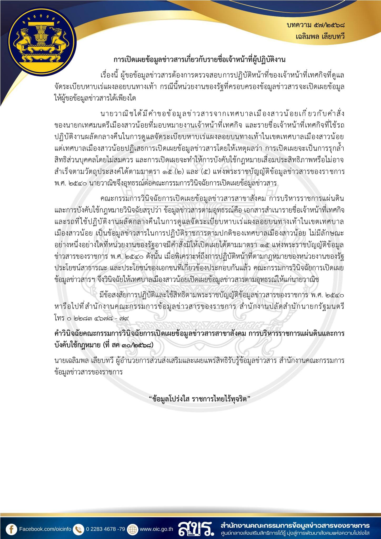 2. เรื่อง การเปิดเผยข้อมูลข่าวสารเกี่ยวกับรายชื่อเจ้าหน้าที่ผู้ปฏิบัติงาน โดยนายเฉลิมพล เลียบทวี