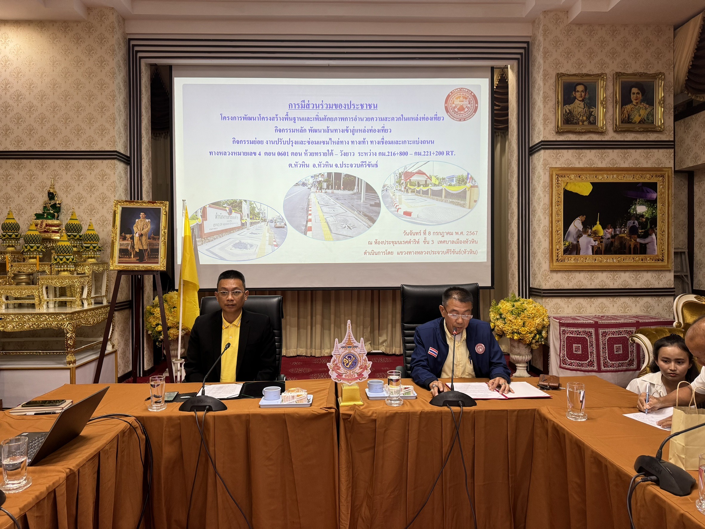 การดำเนินงานการมีส่วนร่วมของประชาชน เพื่อประชาสัมพันธ์ โครงการพัฒนาโครงสร้างพื้นฐานและเพิ่มศักยภาพการอำนวยความสะดวกในการท่องเที่ยว กิจกรรมหลัก พัฒนาเส้นทางทางเข้าสู่แหล่งท่องเที่ยว กิจกรรมย่อย งานปรับปรุงและซ่อมแซมไหล่ทาง ทางเท้า ทางเชื่อมและเกาะแบ่งถนน ทางหลวงหมายเลข 4 ตอน 0601 ตอน ห้วยทรายใต้ – วังยาว ระหว่าง กม.216+800 – กม.221+200 RT. ต.หัวหิน อ.หัวหิน จ.ประจวบคีรีขันธ์
